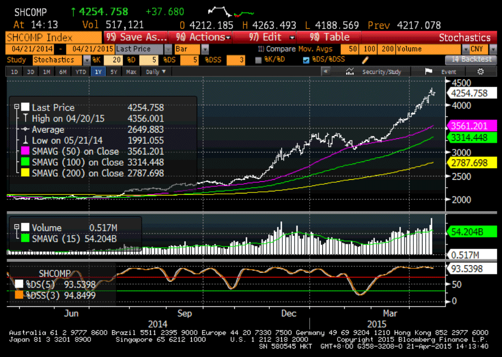 笔者在第二季仍然估计上证指数继续其单边升势,虽然在图形上没有显著的形态,但光从波浪理论来预测,现时上证仍处于上升三浪,第三浪的特性是在整个上升五浪中最长的一个,因此从2014年7月中旬2137点起计,第一浪升至2015年1月9日3558点,升幅为1421点,因此第三浪升幅必有过之而无不及.